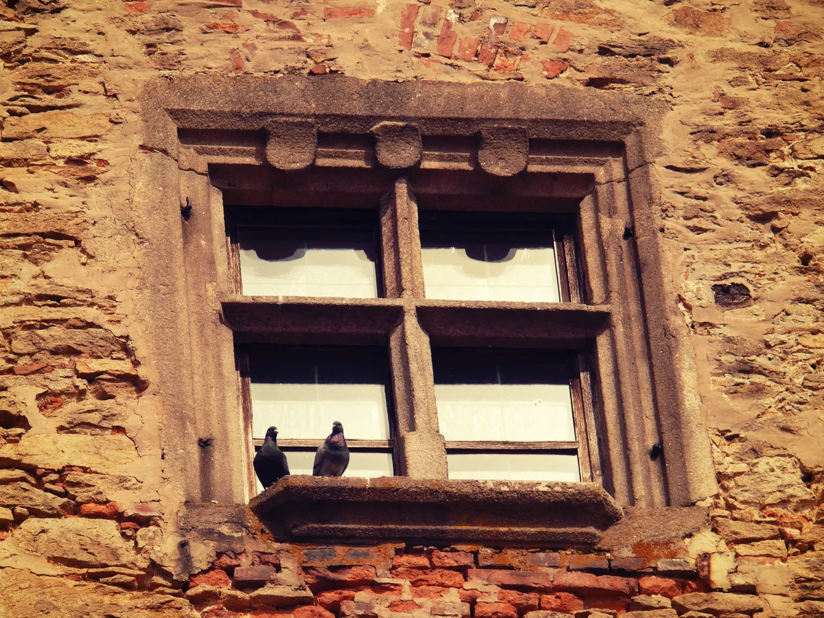 Pigeons on a medieval window. The photo was taken in April 2025 at the castle in Lipnice nad Sázavou.