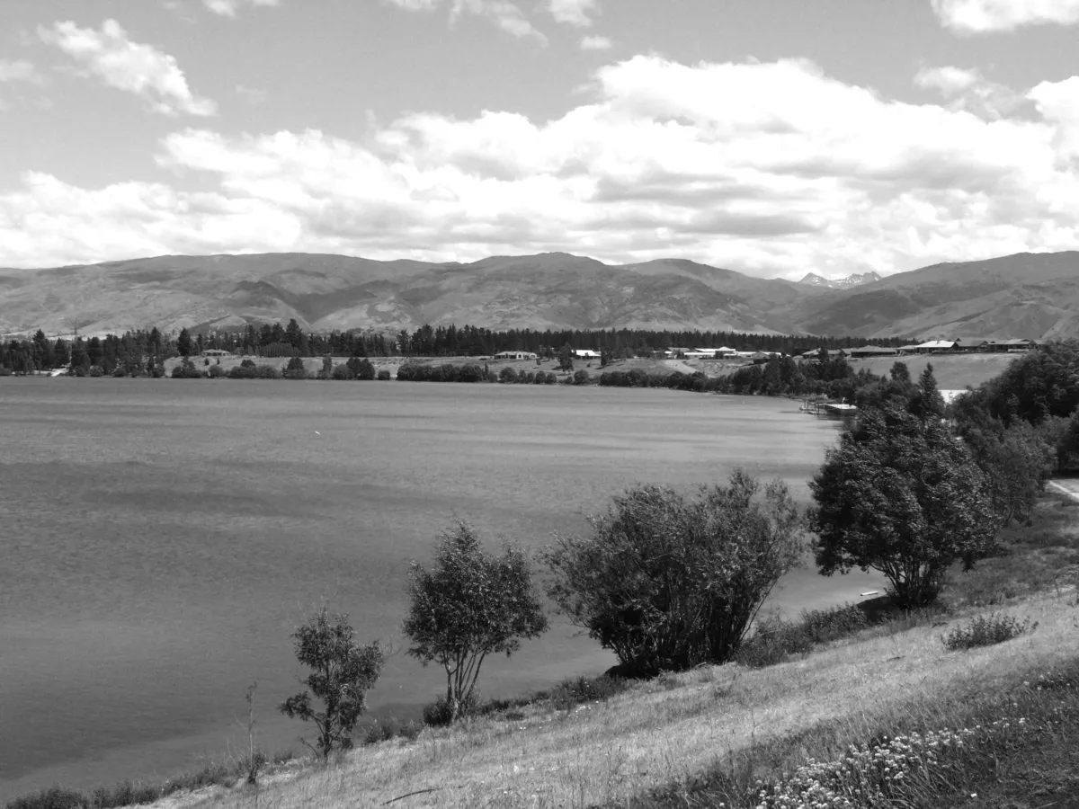 NZ landscape with lake. BW. I took the photo near the town of Cromwell, New Zealand, in December 2010.